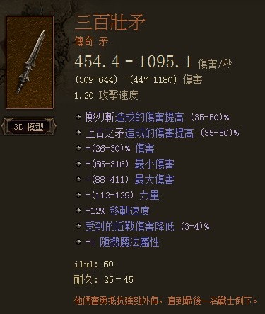 有玩過RPG都知道,主角拿的劍名字都很帥氣且有很多附帶效果,例如以下的 三百壯士專用之茅。諸君,看那一整排額外特性阿!!